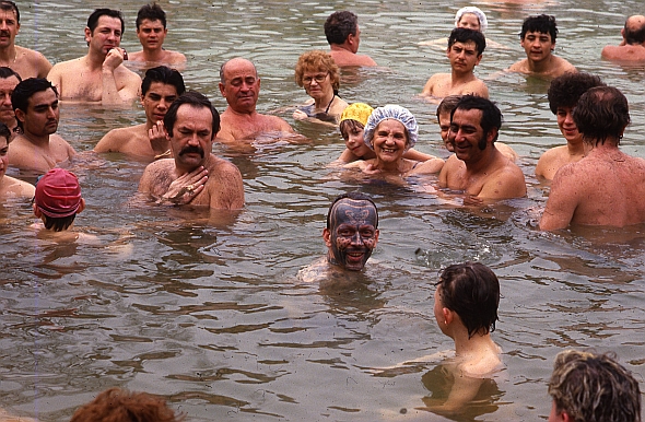 Mivel szép idő volt, Feri barátom javasolta, hogy menjünk ki a Széchenyibe, régen áztatta már meg magát. Nekem ugyan nem volt kedvem a fürdéshez, de, ha már fürödhetnékje volt, nem voltam a jónak elrontója. A pénztárnál kisebb torlódást okoztunk, de be kell vallanom, így a harmadik napon már szinte észre sem vettem, hogy milyen feltűnést keltünk. Kabint is foglaltam részére. Amikor kijött a szabadba, minden szempár felé fordult. Ahogy beereszkedett a vízbe, először elhúzódtak tőle, de sajátos stílusával megnyugtatott mindenkit, hogy ő sem koszosabb, mint bárki a medencében. Nem kell félni, nem oldja a víz a bőrét, amikor kimegy a medencéből, akkor is úgy fog kinézni, mint ahogy bejött.