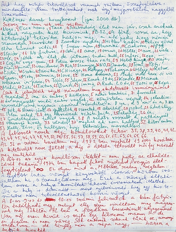 Nem állítom, hogy könnyen olvasható irományt készített, sajnos néhol tolmácsra is szükség van. Sorai közt nehezen igazodik el az ember, de ő különben is nagyon szerette a rejtvényeket. Csak egy megjegyzés: a "kári fütyülőre" amit még 72-ben, Tökölön a fogdán díszített ki, a lehetőségekhez képest rendkívül hosszú feliratot tetovált: "teljes gőzzel előre, huncut vitéz!" No, kíváncsi vagyok: ma, a magukat nagymenőknek nevező tetováltak között ki tud felmutatni ennél hosszabb és találóbb feliratot azon a bizonyos testrészén?