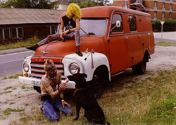 Brigitta Denk és Pillangó. Brigitta nyugat-berlini punk csaj, aki saját, 1923-ban gyártott Opel tűzoltóautójával jött Magyarországra.